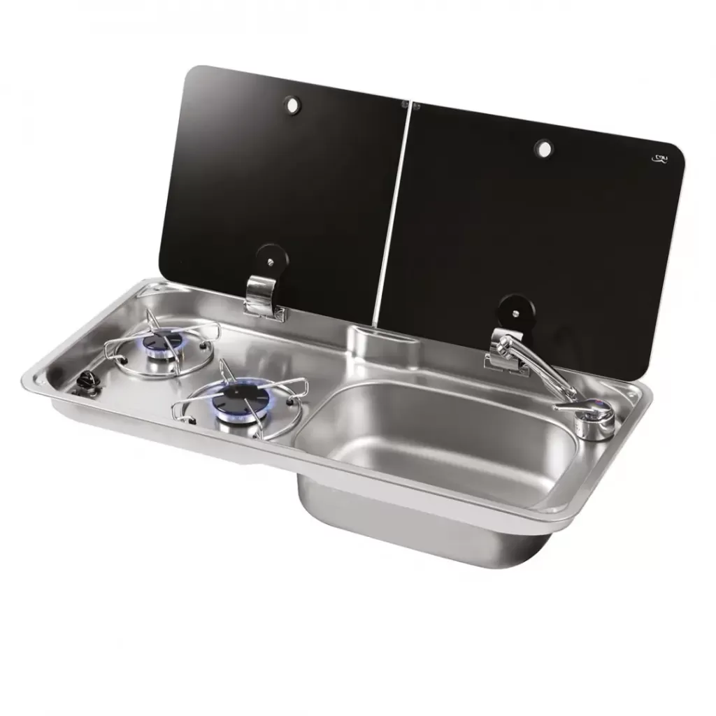 1765-E Cam Kapaklı 2 Gözlü Karavan Ocak Evye Kombinasyonu, kompakt tasarımıyla az yer kaplar ve karavanınızın iç düzenini etkilemez.
