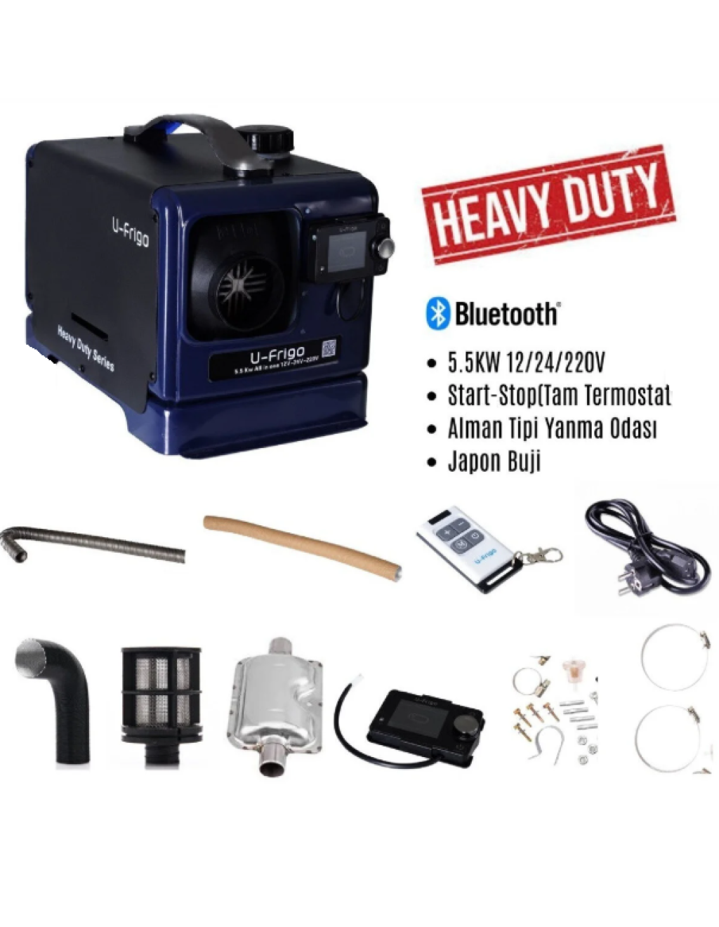 U-FRİGO AIR 5.5 KW dizel araç ısıtıcı, karavan, otobüs, tır, tekne ve binek araçlar için özel olarak tasarlanmış, yüksek verimli ve akıllı özelliklerle donatılmış bir ısıtma sistemidir. 12V ve 24V enerji kaynaklarıyla uyumlu yapısı sayesinde her ortamda güvenle kullanılabilir.